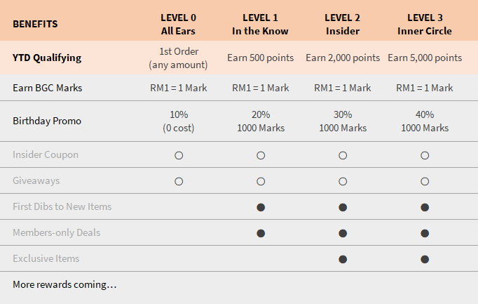 As a new member, you start your BGC Insider membership at Level 0: All Ears as soon as you place your first order. At the end of each calendar year, the total BGC Marks you earned for that year would determine your membership level for the following year. For eg if you earned 2,250 marks for this year, you'll start next year as Level 2: Insider.