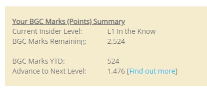 Each BGC Mark you earned brings you closer to the Next Level of BGC Insider rewards!