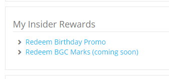 You can redeem your BGC Marks for Birthday Promo coupons, rebate coupons or other rewards as provided by your Membership Level. To redeem, go to My Account - My Insider Rewards area in our webstore's Customer Area, and select the appropriate option.