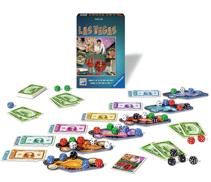 In more detail, Las Vegas includes six cardboard casino mats, one for each side of a normal six-sided die. For each mat, players draw money cards until at least $50k is showing, but the amount may end up being a lot more, making that casino more desirable.