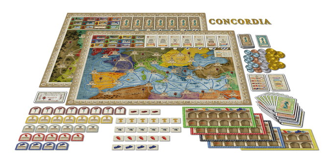 Concordia is a strategy game which requires advance planning and consideration of your opponent's moves. Every game is different, not only because of the sequence of new cards on sale but also due to the modular layout of cities. (One side of the game board shows the entire Roman Empire with 30 cities for 3-5 players, while the other shows Roman Italy with 25 cities for 2-4 players.) When all cards have been sold, the game ends. The player with the most VPs from the gods (Jupiter, Saturnus, Mercurius, Minerva, Vulcanus, etc.) wins the game.