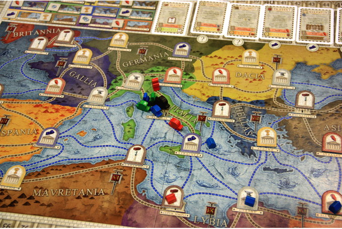 Two thousand years ago, the Roman Empire ruled the lands around the Mediterranean Sea. With peace at the borders, harmony inside the provinces, uniform law, and a common currency, the economy thrived and gave rise to mighty Roman dynasties as they expanded throughout the numerous cities. Guide one of these dynasties and send colonists to the remote realms of the Empire; develop your trade network; and appease the ancient gods for their favor — all to gain the chance to emerge victorious!