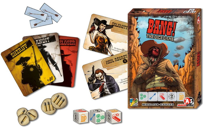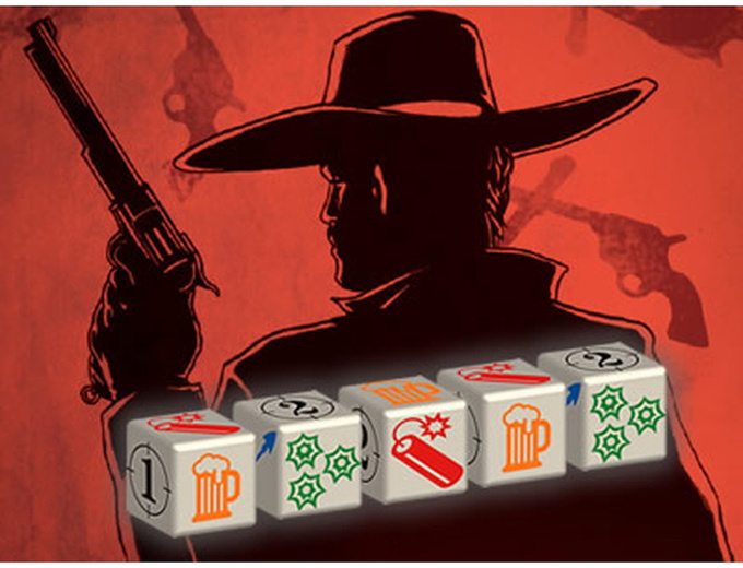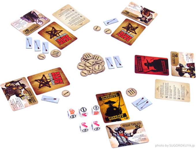 Each player also receives a character card which grants him a special power in the game. The Sheriff reveals his role card and takes the first turn of the game. On a turn, a player can roll the five dice up to three times, using the results of the dice to shoot neighboring players, increase the range of his shots, heal his (or anyone else's) life points, or put him in range of the Indians, which are represented by nine tokens in the center of the table. Each time a player rolls an arrow, he takes one of these tokens; when the final token is taken, each player loses one life point for each token he holds, then the tokens are returned to the center of the table.