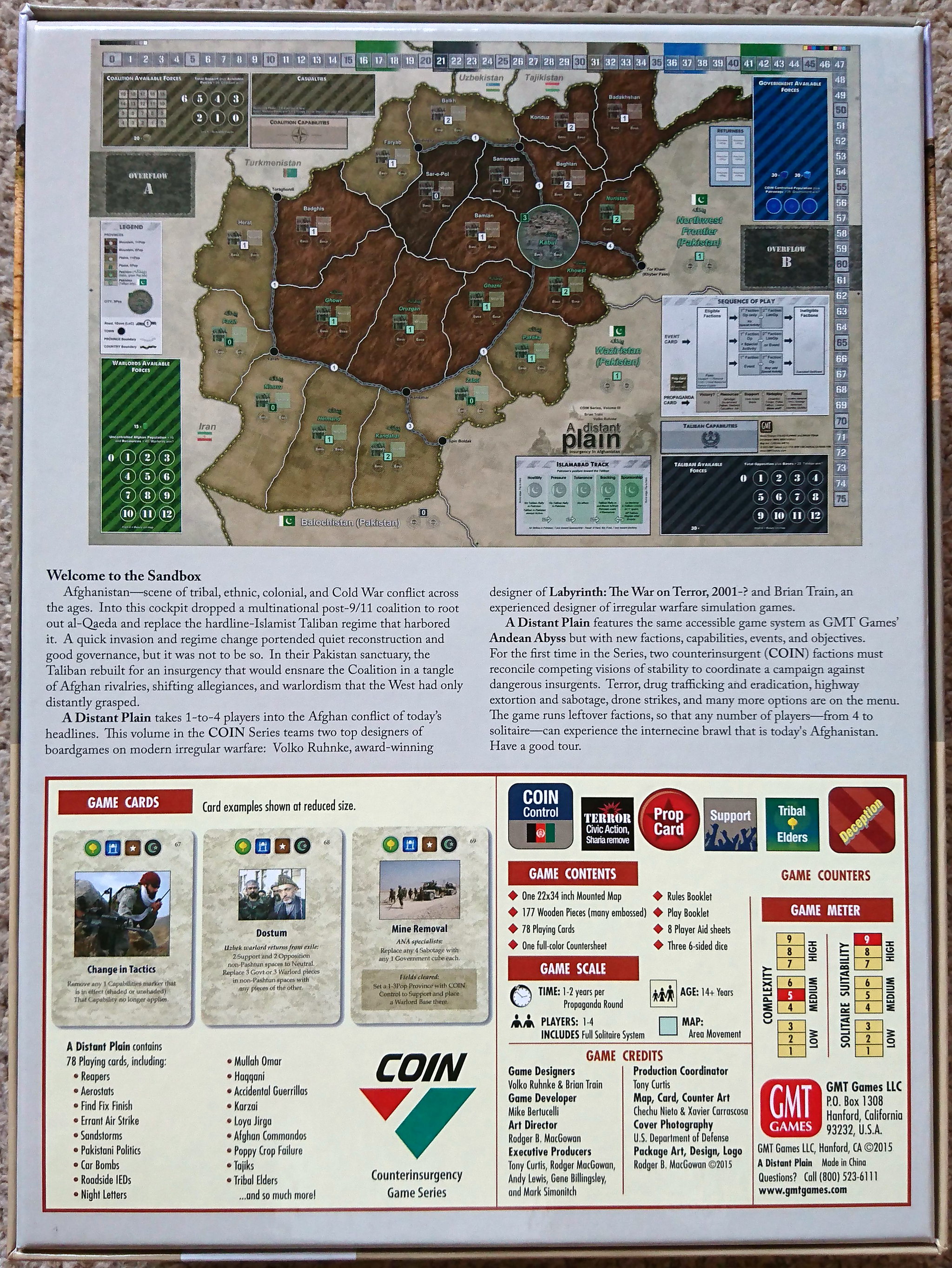A Distant Plain features the same accessible game system as GMT's recent Andean Abyss and upcoming Cuba Libre but with new factions, capabilities, events, and objectives. For the first time in the Series, two counterinsurgent (COIN) factions must reconcile competing visions for Afghanistan in order to coordinate a campaign against a dangerous twin insurgency.