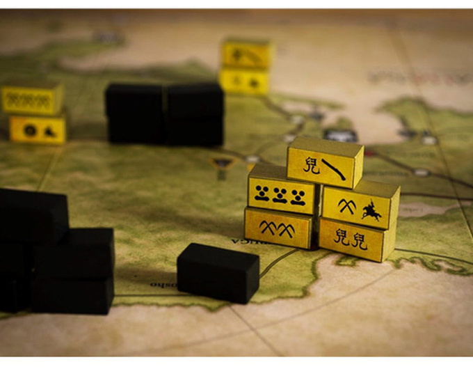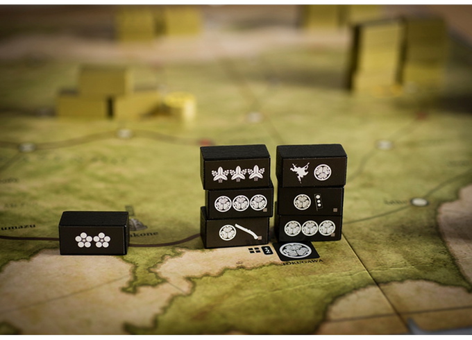Blocks are large and stackable. Every unit on the board is visible at once, and the strategic situation is comprehensible at a glance. Components use authentic clan designations and colors, and have a Japanese feel.