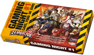 All you need to have a nice Zombicide night! The first Gaming Night Kit is called "Cars, Food or Guns" and features the famous Kyoko. Your team has to choose what's best for survival among the three options, and play accordingly. When the dawn finally comes, you may come home with prizes!
