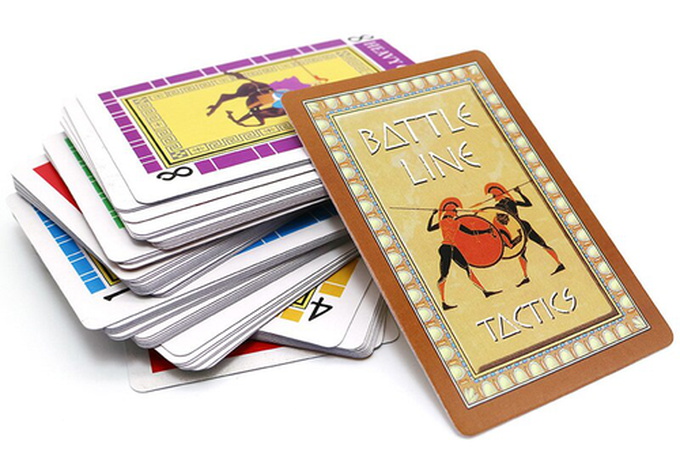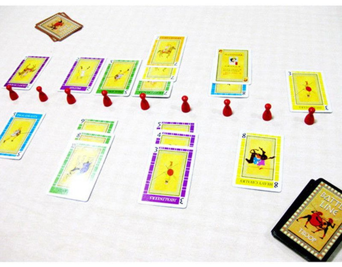 This is a rethemed version of Schotten Totten with different graphics and wooden flag bits in place of the boundary stone cards. Game play is identical, except the cards run from 1 to 10 (not 9), you hold seven cards in your hand (not 6), and the rule that stones may only be claimed at the start of your turn is presented as an "advanced variant". Also the tactics cards were introduced by Battle Line; these cards were only added to later editions of Schotten-Totten.
