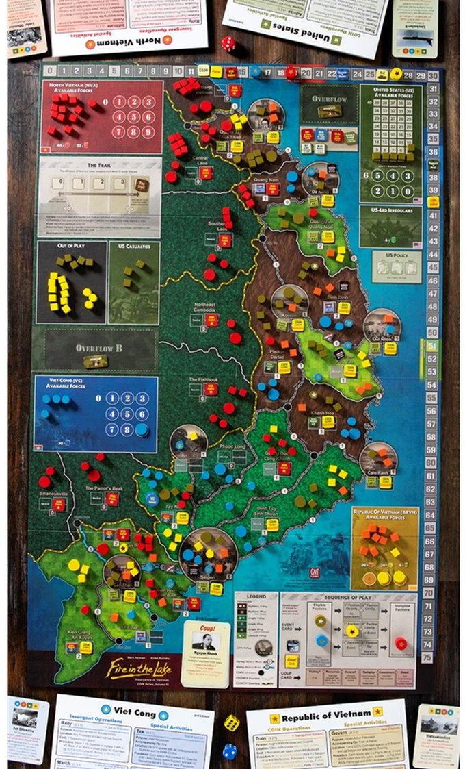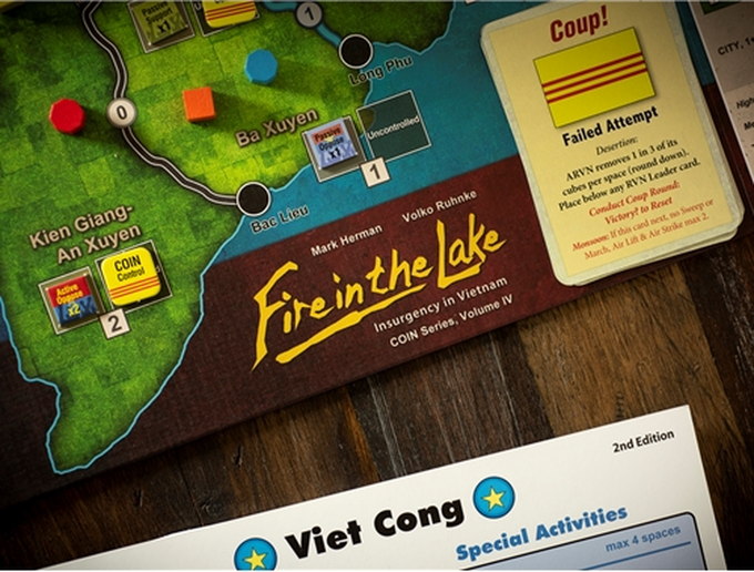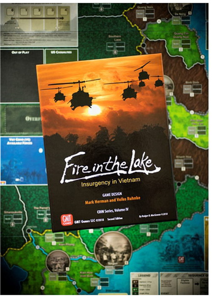 Renowned designer and modern warfare expert Mark Herman joins COIN Series creator Volko Ruhnke for a collaborative production not to be missed. Fire in the Lake features the same card-assisted counterinsurgency game system as GMT's Andean Abyss, Cuba Libre, and A Distant Plain, with a pack of twists that take the Series to another level, including: