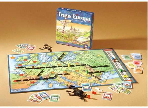 Trans Europa is a Tactical Track-Building Game. Europe needs railroads and it is your job to provide them. Players work together building a railroad network, but this time it is across Europe instead of the United States. The first to have their five cities connected winds the round -- the others lose points for being too slow!