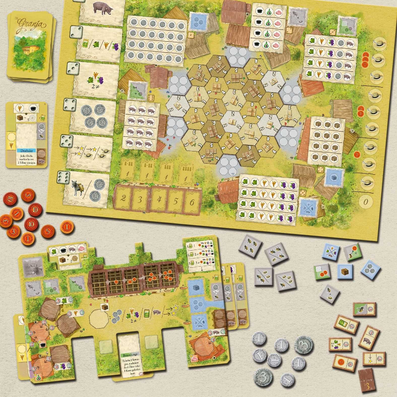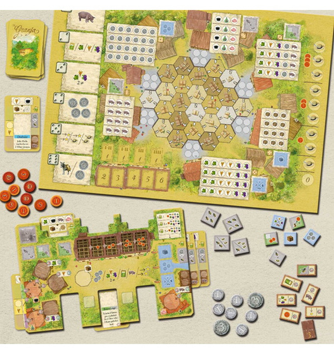 In La Granja, players control small farms by the Alpich pond near the village of Esporles on the island of Mallorca. Over time, the players develop their farms and deliver goods to the village. Players are vying to earn the title of "La Granja" for their country estate!