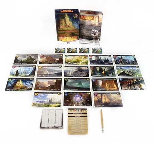 Tides of Time is a drafting game for two players. Each game consists of three rounds in which players draft cards from their hands to build their kingdom. Each card is one of five suits and also has a scoring objective. After all cards have been drafted for the round, players total their points based on the suits of cards they collected and the scoring objectives on each card, then they record their score. Each round, the players each select one card to leave in their kingdom as a "relic of the past" to help them in later rounds. After three rounds, the player with the the most prosperous kingdom wins.
