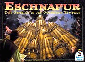 Eschnapur is subtitled Das Geheimnis des Goldenen Tempels which means The Secret of the Golden Temple. 3-5 scientists have decided to bring the secrets of the Golden Temple into the daylight which, of course, would bring them glory and honor - and whoever gets most of it wins the game. If a player cannot keep up he receives help from the Laughing Temple Monk (a beautiful " tall solid figure) who doubles the lowest score on the scoreboard and keeps the excitement-level up right to the end of the game.