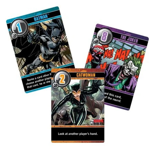 From a deck with only sixteen cards, each player starts with only one card in hand; one card is removed from play. On a turn, you draw one card, and play one card, using the power on that card to expose others and (possibly) knock them out of the round. If you use Batman's ability to KO someone (other than Robin), you score one point, with points being tracked via Batsignal tokens. If you're the final player active in the round or the player with the highest card when the deck runs out, then you score a point.