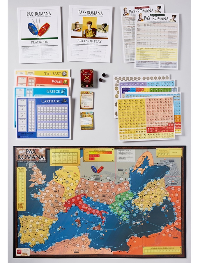 PAX ROMANA includes one gamemap, 55 cards, 400+ counters, and a host of play aids and charts to keep things organized.