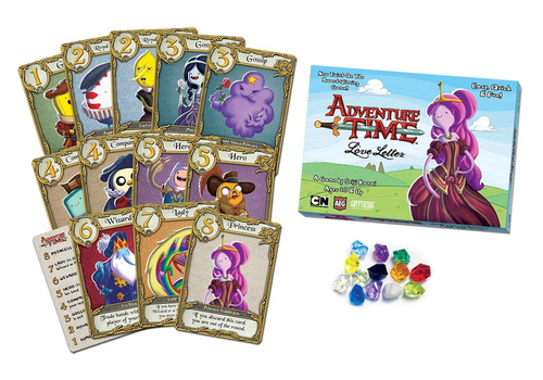 Adventure Time Love Letter is a game of risk, deduction, and luck for 2–4 players based on the original Love Letter game by Seiji Kanai, except re-themed with characters of the hit cartoon Adventure Time. Players are suitors trying to gain the affections of Princess Bubblegum (#8).