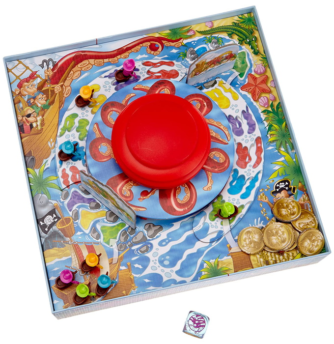 The star of Titus Tentacle is the octopod itself, which is placed in the center of the game board. Each player has two ships, and on a turn the active player rolls the color die, then moves one of their ships to the next empty space of that color on the game board; the ships circle the board clockwise with the goal of reaching Treasure Island. If a player rolls red, then they turn Titus Tentacle to what they hope is a favorable position, then they bop the octopus on the head, shooting out its limbs and (fingers crossed!) knocking over opposing ships. Any ships knocked over this way must return to start, but a couple of rocky locations along the path can provide safe haven.