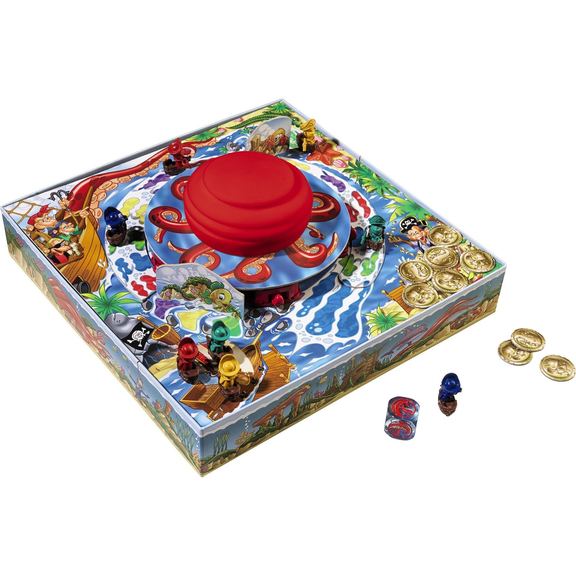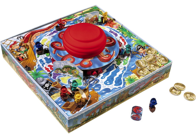 If a pirate reaches Treasure Island, they take one gold coin, then return that ship to start. Whichever pirate first claims three gold coins wins!