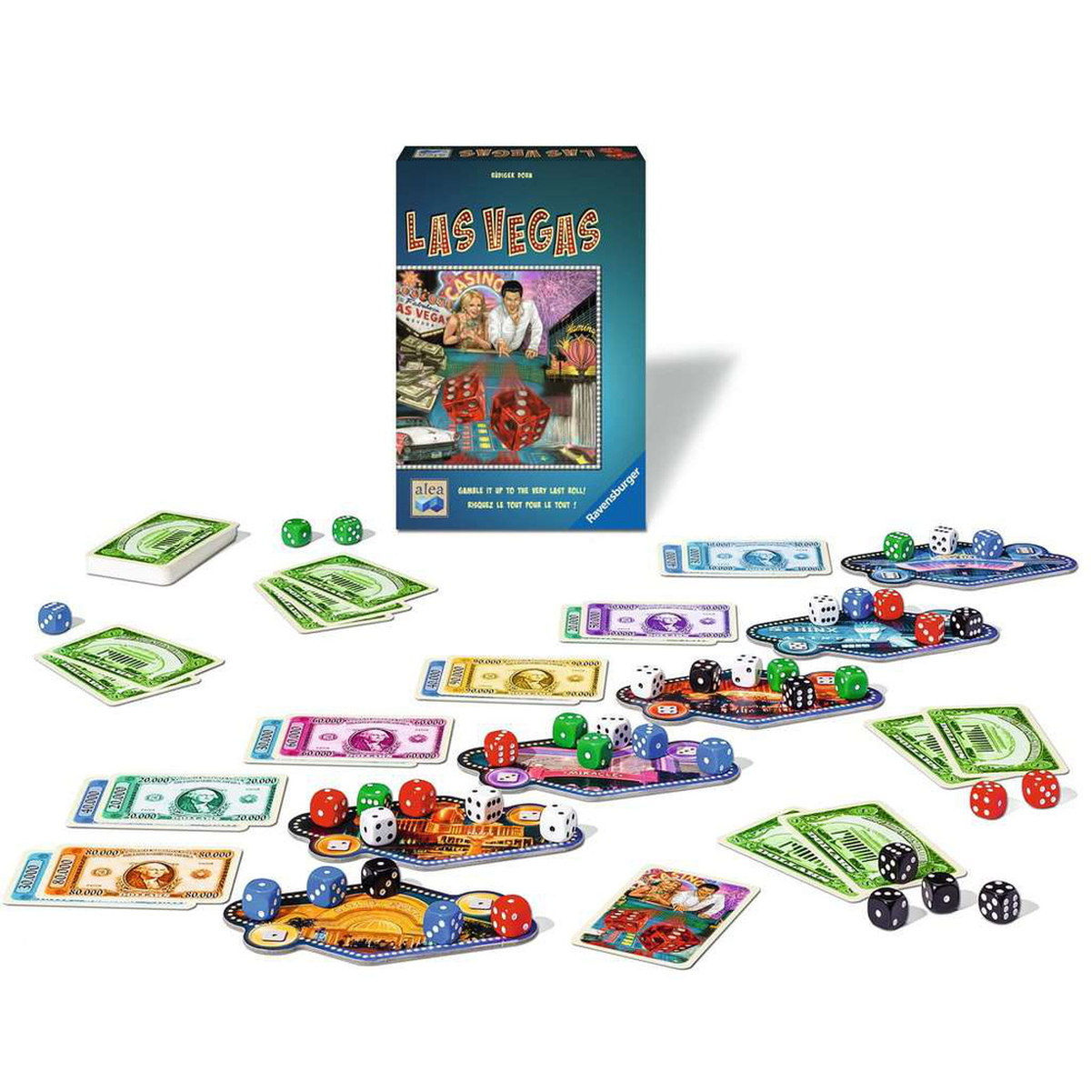 In more detail, Las Vegas includes six cardboard casino mats, one for each side of a normal six-sided die. For each mat, players draw money cards until at least $50k is showing, but the amount may end up being a lot more, making that casino more desirable.