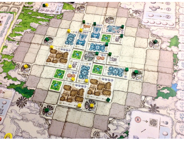 The game lasts seven months (seven turns), during which the modular buildings will be implemented. Each turn consists of a buying phase (through an original system) followed by a worker placement phase. A special worker allows the first player to occupy the action spot to realize it with a bonus. The dome of Dilluvia is space limited, and all terrain must be bought and approved by the government (as there are some restrictions) before placing any building. Players will also struggle to occupy the preferable areas and try to achieve goals that bring them honorific titles and additional prestige.