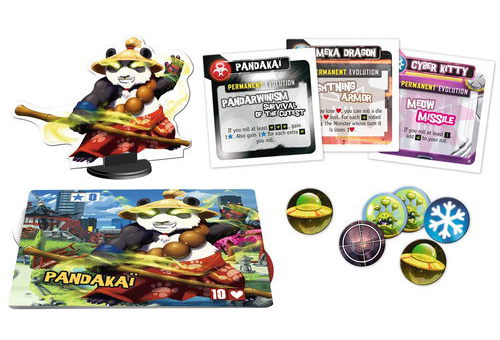 With King of Tokyo (Second Edition): Power Up! – an expansion for the King of Tokyo base game – Included is the new monster Pandakai, a giant panda bear. After choosing a monster, each player takes the eight Evolution cards associated with that monster, shuffles those cards, and creates a personal deck. At the end of a player's turn, if she has three hearts, she draws one Evolution card and adds it to her hand; this is possible even in Tokyo (when hearts are normally useless) and even if the hearts are used for some other action, such as healing.