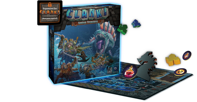 In Clank! Sunken Treasures, an expansion for Clank! A Deck-Building Adventure, players explore two partially flooded maps with new dungeon deck cards, a new persistent monster to defeat, new environmental challenges, and more as they venture in the watery depths!
