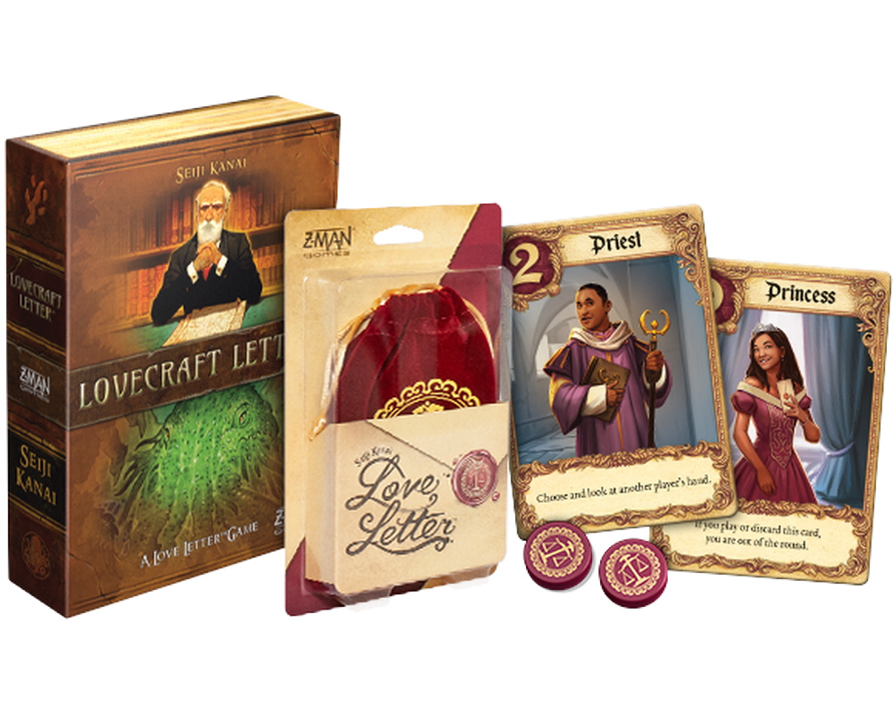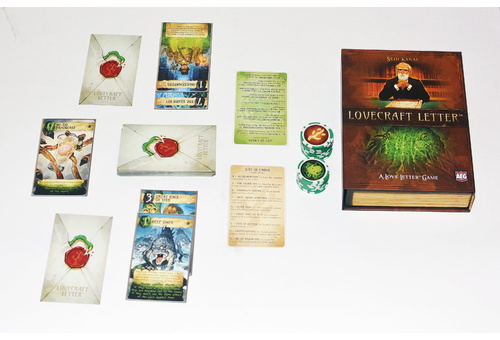 Lovecraft Letter is a card game that combines the Love Letter system with the world of H.P. Lovecraft. In addition to the standard sixteen cards in the Love Letter game are new versions of the cards that include special "insanity" powers. If you have one of these cards in your discard pile, then you are insane (at least for the current round) and on future turns can play insanity cards for their regular power or their special power, giving you more options during play. The risk, however, is that you must undergo a sanity check at the start of each of your turns, drawing as many cards from the deck as the number of insanity cards in front of you; draw one or more insanity cards, and you're out for the round.