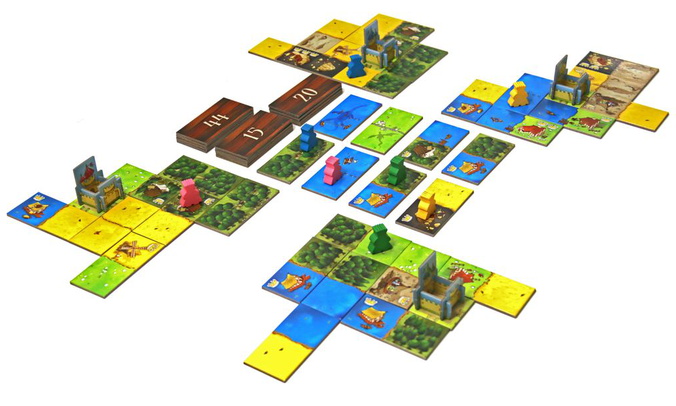 The game uses tiles with two sections, similar to Dominoes. Each turn, each player will select a new domino to connect to their existing kingdom, making sure at least one of its sides connects to a matching terrain type already in play. The order of who picks first depends on which tile was previously chosen, with better tiles forcing players to pick later in the next round. The game ends when each player has completed a 5x5 grid (or failed to do so), and points are counted based on number of connecting tiles and valuable crown symbols.