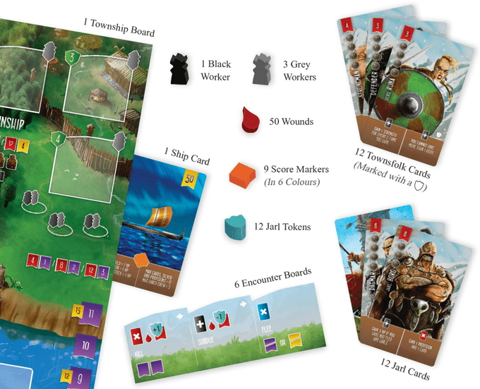 In addition to including components for an extra player, Fields of Fame also includes the new township board, enemy jarl tokens and cards, fame, damage and a variety of new townsfolk.