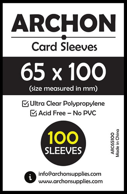 This is card protection sleeves from ARCHON 65 X 100 MM. This pack contains 100 sleeves per pack and is designed to protect any card that is sized at 65 X 100 MM or smaller.