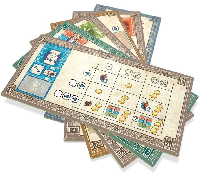 In Teotihuacan: City of Gods, each player commands a force of worker dice, which grow in strength with every move. On your turn, you move a worker around a modular board, always choosing one of two areas of the location tile you land on: one offering you an action (and a worker upgrade), the other providing you with a powerful bonus (but without an upgrade).