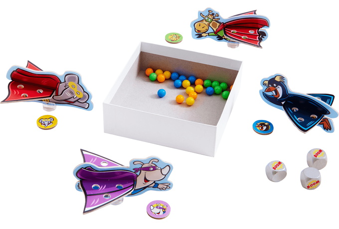Watch out! The spider monkeys want to throw gross slime balls at the city residents. Rhino Hero and his friends are needed; players grab the slime balls and balance them on their super heroes’ cape, transporting them as quickly as possible to their hero headquarters. Heroes can't let themselves get flustered by the other players. They need skill and courage to carry more and more slime balls out of the city each round.