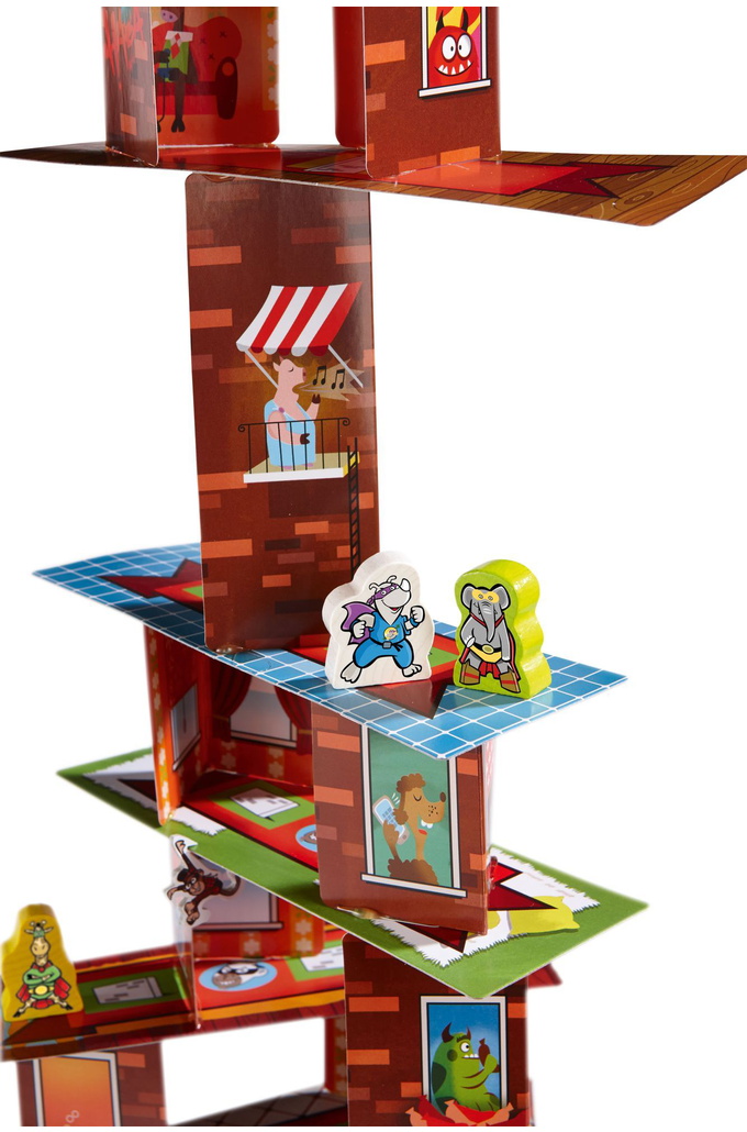 Rhino Hero is back on the job — and this time not only does the wobbly skyscraper need to be climbed, but there will also be fierce battles between the four super-heroes Rhino Hero, Giraffe Boy, Big E. and Batguin. Who will win the battles and not let themselves be bothered by the mean, hanging spider monkeys?