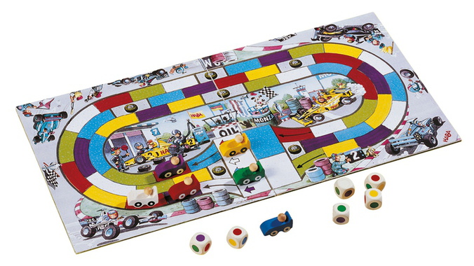 1) Six racing cars are standing on the starting grid, of the 3 lane racing board. But only the player who gets the right colors with the dice and makes clever combinations will be able to move rapidly ahead.