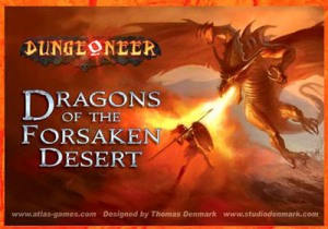 Dragons of the Forsaken Desert is a two- to four-player Dungeoneer card game. Your character explores a wilderness that you build with map cards, while fighting monsters, completing quests, and leveling up along the way.