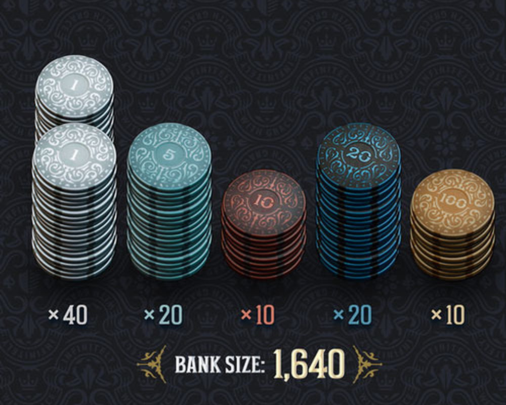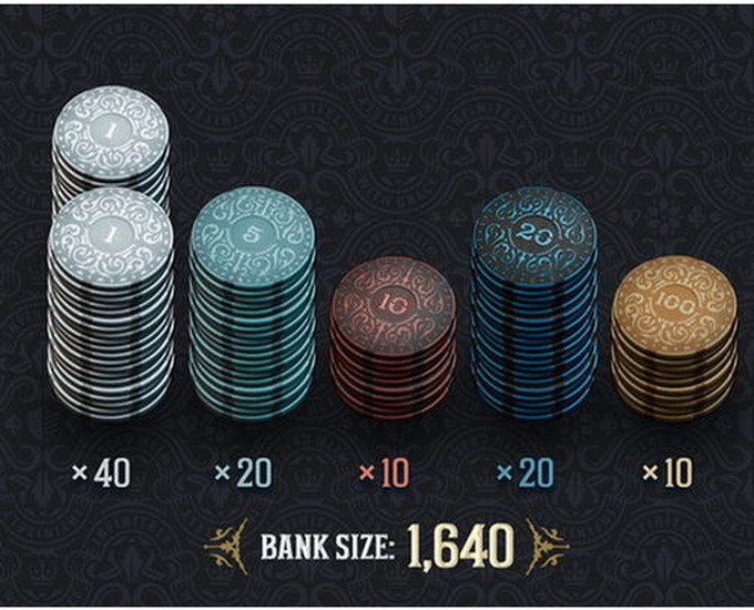 The total bank for this set has a value of $1,640 with the following 5 denominations: