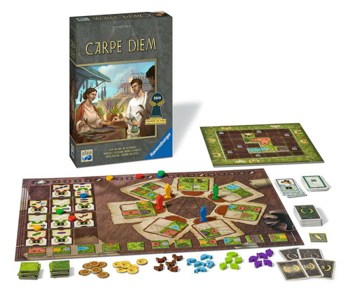 In Carpe Diem, the players slip into the role of rich patricians in ancient Rome. Everyone is trying to build a lucrative district to score as many prestige points as possible. The novel way to get to the individual buildings of his district, and the varied display of the many different score cards makes the game to an unusual and very varied strategy game of the successful author Stefan Feld.