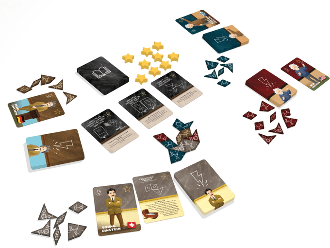 Each Einstein has their own deck of Inspiration Cards based on the real happenings of his life. These inspirations give you simple theories to complete. Using ideas from four different branches of science - physics, mathematics, chemistry, and philosophy - represented by four shapes, each Einstein places tiles representing their ideas onto an emergent common board. Players get points for completing their own theories, contributing to the theories of other players, and helping to finish major theories from Einstein's life.