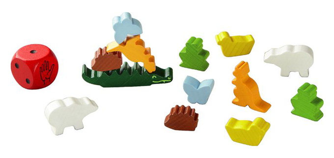 In Animal Upon Animal: Small and Yet Great!, the players build an animal pyramid by stacking their animals one by one on top of each other, without any of them falling off. The die indicates how many animals can be stacked, where and who shall stack them. Be the first to stack all of your animals in the pyramid and you win!