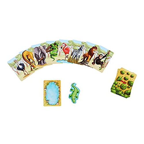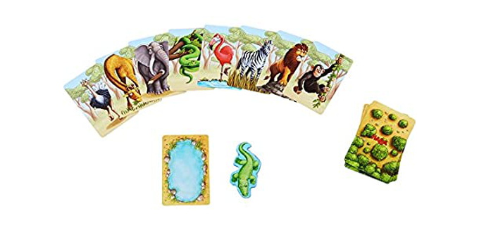 The wild animals meet at the watering hole. But only one of each animal type can be there at a time. If there are two of the same animal then: be quick and hit the crocodile in the watering hole with your hand! The fastest player receives all the animals that are at the watering hole. Who will manage to have all the animal cards at the end?