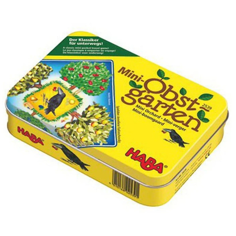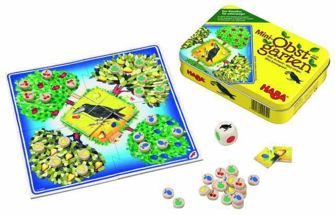 ORCHARD (Obstgarten) is a cooperative game for two or more players aged 3 and up. Only a quick harvesting of the trees carrying crunchy cherries, juicy apples, sweet pears and marvellous plums prevents the snitching of fruits by the impudent and insatiable raven. All players work together to harvest the fruits.