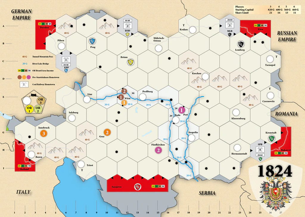 1824 Austria-Hungary is a railway building and share dealing game for 3-6 players. It is based on Francis Tresham's game 1829 and on Leonhard Orgler's game 1837.