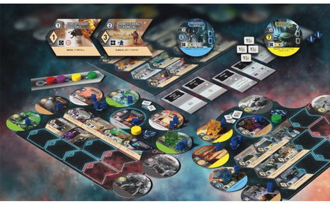 Play continues until one or more of four game ending conditions is reached. After all actions for that round have been done, the player with the most victory points from settled worlds, developments, 9-cost development bonuses, and VP chips earned from consuming goods wins.