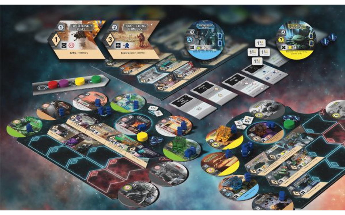 In New Frontiers, a standalone game in the Race for the Galaxy family, players build galactic empires by selecting, in turn, an action that everyone may do, with only the selecting player gaining that action's bonus.