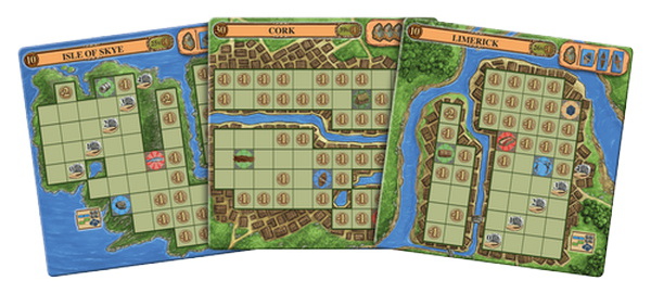 The first large expansion for A Feast for Odin, The Norwegians includes four new islands (Isle of Man, Isle of Skye, Islay, Outer Hebrides) with Irish coastal viking-settlements on the backside (Waterford, Wexford, Cork, Limerick), where people from Norway came to stay through the winter (longphort), to trade at, and to settle nearby. This offers new strategies and new puzzle-tiles like horse (6VP, 2x5 spaces)/pregnant horse/leather(green)/vadmal(blue) and pigs (1 VP, breed every round; 2x3 - 1 = 5 spaces)/herbal (orange)/ antler (green)/tools (blue). The game has a third box for the tiles and offers the four old islands too (renewed little different VPs and new graphic-aspects of mini-expansion islands Lofoten/Orkneys/Tierra del Fuego).