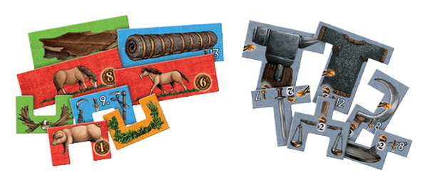 The expansion includes another mountain-strip (last round), more two-silver coins, meat/beans and runes/oil and a "little emigration" piece that covers one food instead of two. You get it on a new action-space for giving away a whaling boat. The renewed action board has three pieces that can be turned around for different numbers of players (version for 1-2, 3, and 4 players), which increases the chances of players getting in each others way. It contains new opportunities like butchering, elk-hunting, fishing, and thievery, along with changes for some old actions. It's now easier, for example, to play an animal strategy, also because you can now get two of the same animals in one action. There is also a new fifth column to make a (better) action with your last viking! You can smith, for example, now a grey piece with maximum of eight swords by using an ore and only one action. Also for this, there are five new grey puzzle-pieces like pan, hauberk or anvil and a little board for smithable pieces with fewer than nine swords.