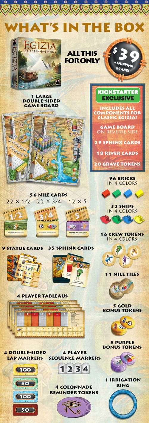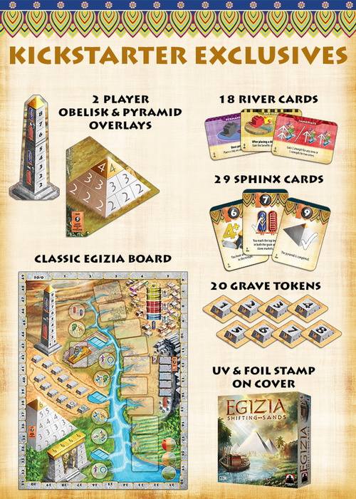 Egizia: Shifting Sands Edition keeps all the painstaking risk/reward decisions of the original Egizia and adds new depths of strategy, balance, and gameplay for a fresh twist on a timeless classic.