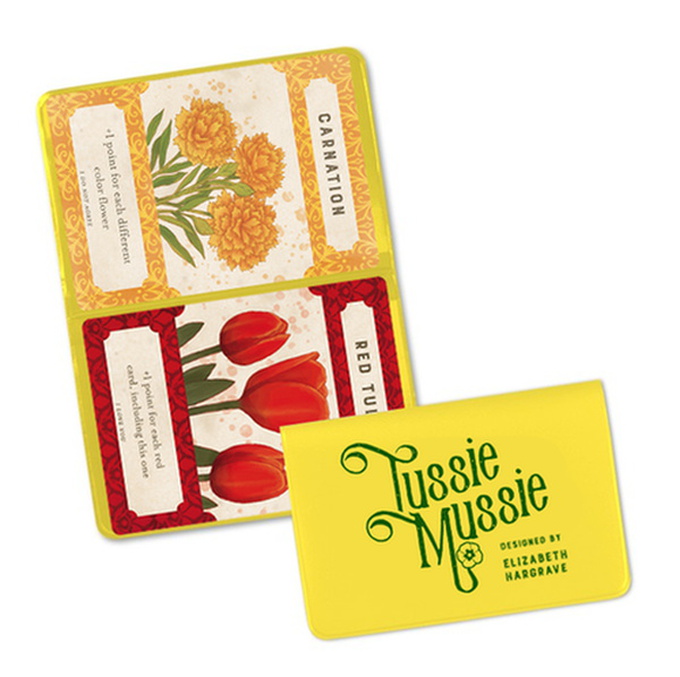 Tussie-Mussie is based on Victorian fad that assigned meanings to the flowers that friends and lovers exchanged.Featuring an I-Divide-You-Choose drafting, this Microgame of 18 cards is played over 3 Rounds and each Round has each player score the effects and hearts of their 4 cards.Players look at the top two cards, submitting one face-up and another facedown. The next player takes one, with the player receiving the other. Co-Winner of the GenCan't Design Contest.