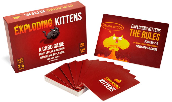 Exploding Kittens is a kitty-powered version of Russian Roulette. Players take turns drawing cards until someone draws an exploding kitten and loses the game. The deck is made up of cards that let you avoid exploding by peeking at cards before you draw, forcing your opponent to draw multiple cards, or shuffling the deck.