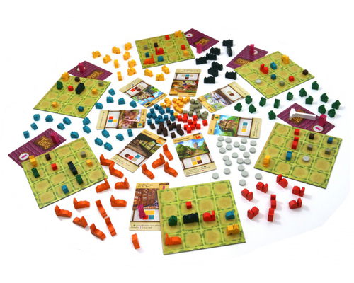 In Tiny Towns, your town is represented by a 4x4 grid on which you will place resource cubes in specific layouts to construct buildings. Each building scores victory points (VPs) in a unique way. When no player can place any more resources or construct any buildings, the game ends, and any squares without a building are worth -1 VP. The player with the most VP wins!