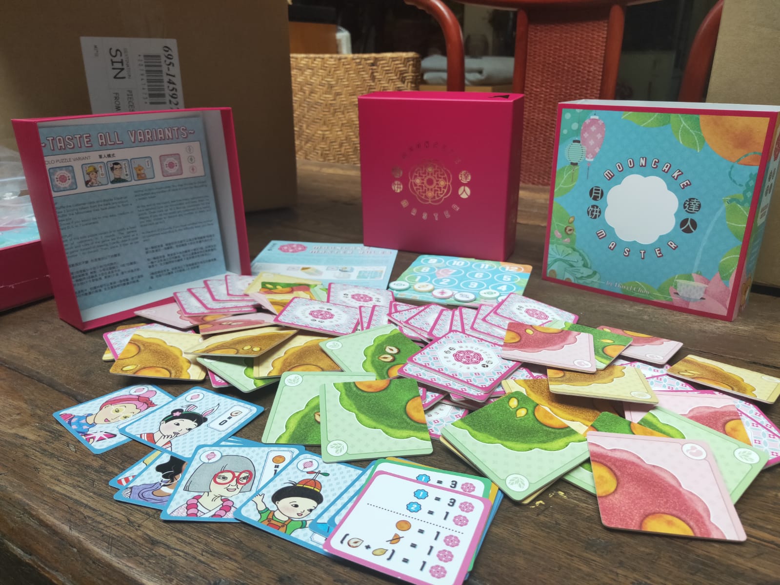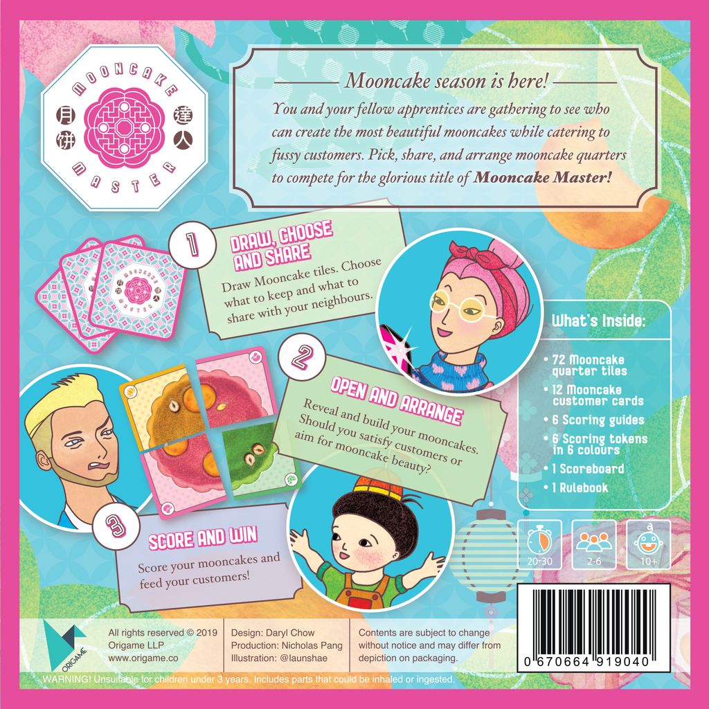 Over 3 rounds, players simultaneously draw, share, and fit Mooncake quarter tiles, creating beautiful mooncakes for judging as well as for selling to customers.